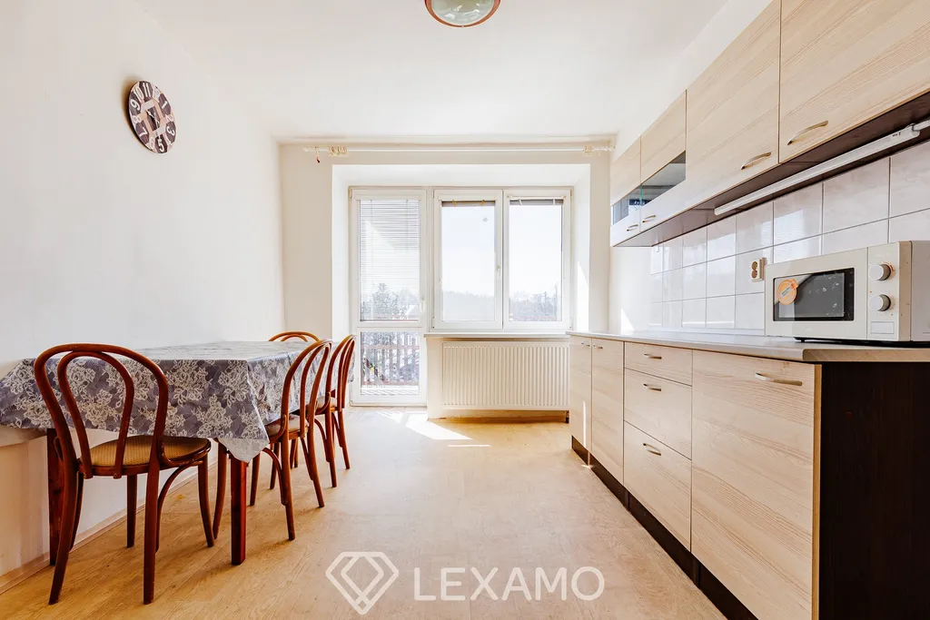 Dispozice zahrnuje obývací pokoj, dvě ložnice, kuchyň, koupelnu a samostatné WC. Součástí bytu je také prostorný balkon, který poskytuje příjemné místo k odpočinku.