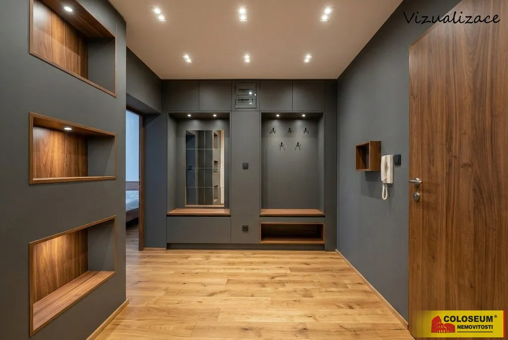 Koupelna je prostorná a nabízí možnost realizace sprchového koutu i vany. Toaleta je samostatná a umístěná na chodbě. Praktická chodba s podsvícenými nikami vytváří zajímavý designový prvek a zároveň poskytuje úložné možnosti, stejně jako šikovná spížka.