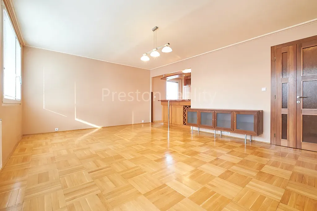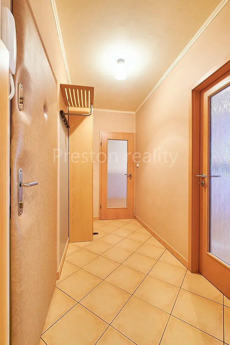 Byt se skládá z velkého obývacího pokoje (32 m2) a dvou pokojů – ložnic (13 a 16 m2), které jsou vybaveny skříněmi, z nichž jeden má vstup na prosklenou lodžii. Součástí obývacího pokoje je kuchyňský kout s vlastním oknem a s plně vybavenou kuchyňskou linkou (plynová varná deska, horkovzdušná trouba, myčka, lednice, mrazák, digestoř). Na podlahách všech hlavních místností jsou pěkné dřevěné parkety.