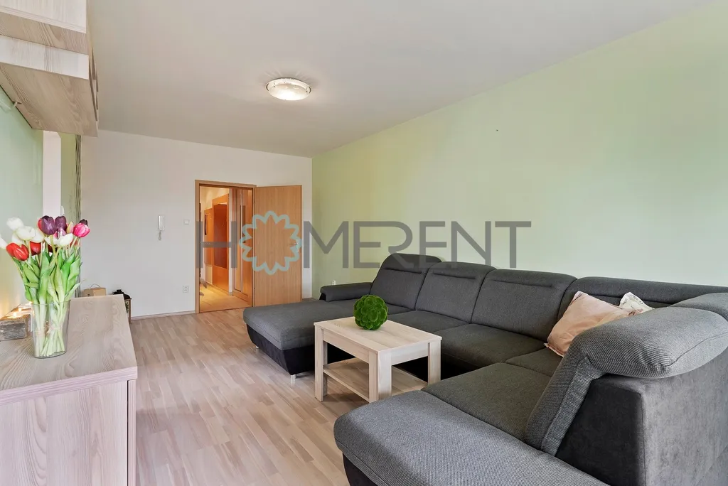 Byt je kompletně zařízený a jeho součástí je kuchyně s jídelním stolem, obývací pokoj, hlavní ložnice, dětský pokoj bez postele, koupelna s vanou a pračkou a samostatné WC. Součástí je i sklepní kóje.