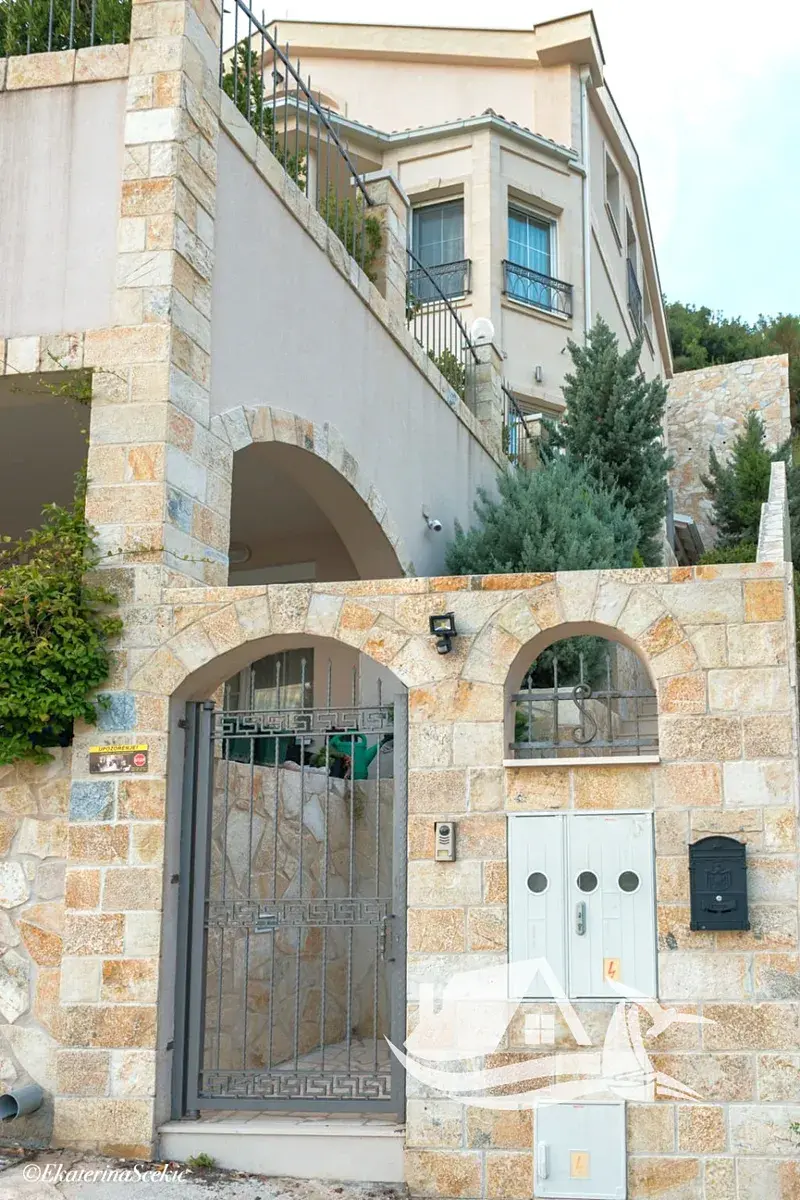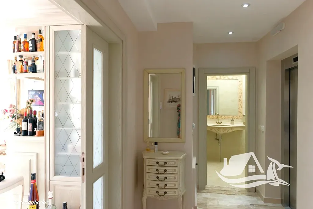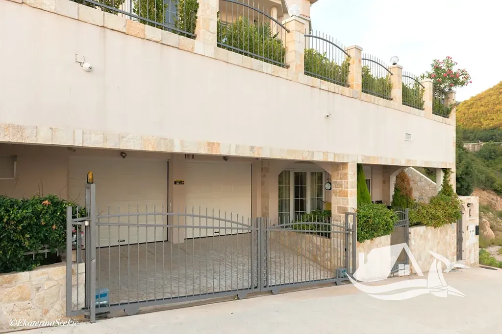 V přízemí se nachází samostatné mini-apartmány s kuchyní, jídelní částí, ložnicí a koupelnou, ideální pro hosty nebo krátkodobý pronájem. Součástí je otevřená veranda se zelení a výhledem na moře, dále garáž pro dva vozy, technické zázemí, wellness se saunou a relaxační zónou, sprchou a toaletou, a také vinný sklep.