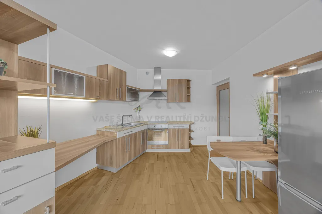 * Pohodlný stav k okamžitému bydlení nebo pronájmu – vestavěný dřevěný nábytek, plovoucí podlahy. (Garáže v domě dostupné, ale ne k bytu.)