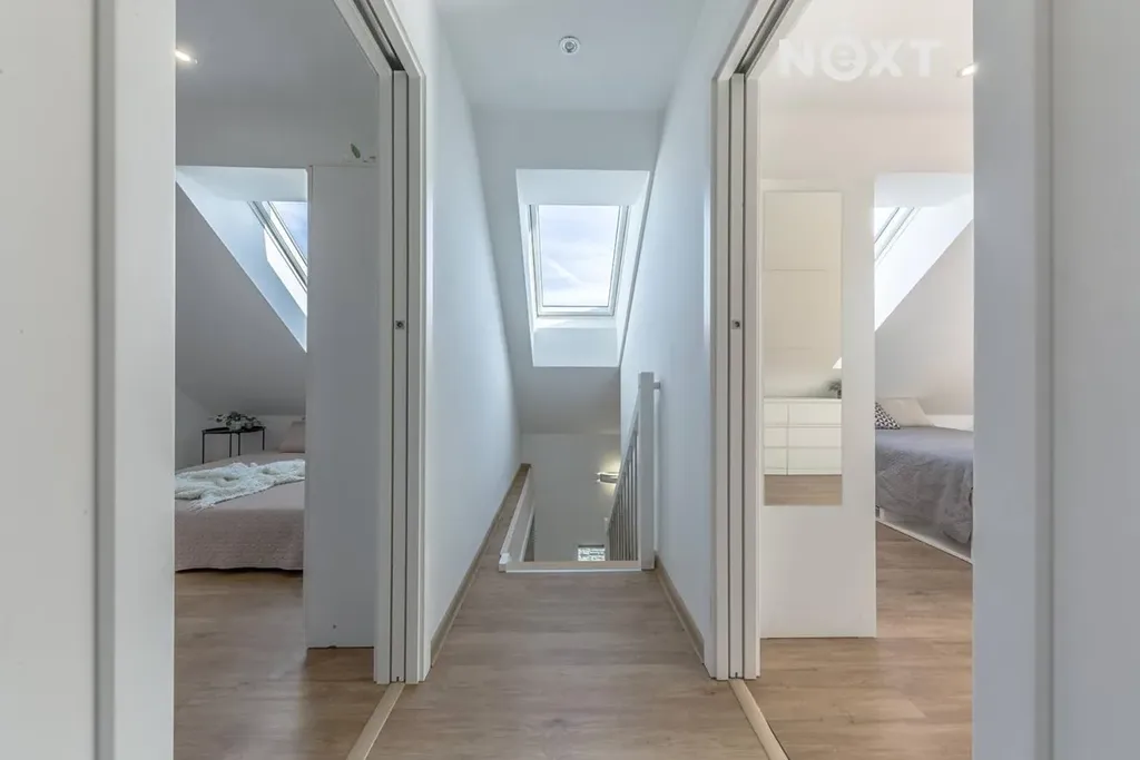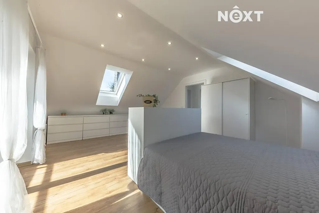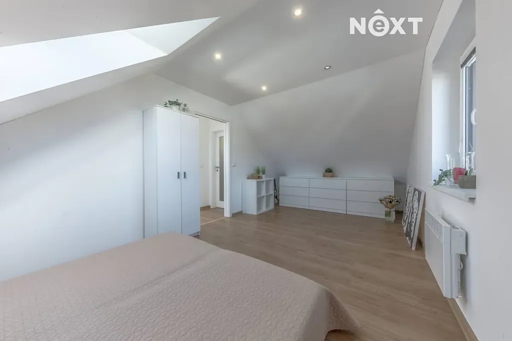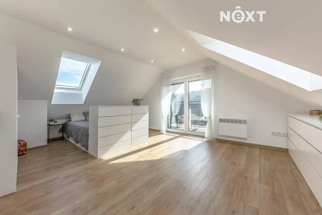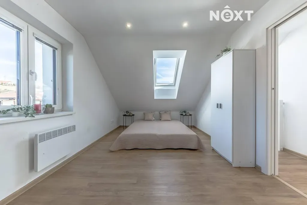 Dva prostorné světlé samostatné pokoje. Z jednoho je vstup na jižně orientovaný balkon (cca 3 m²). V patře se nachází také samostatné WC s umyvadlem.