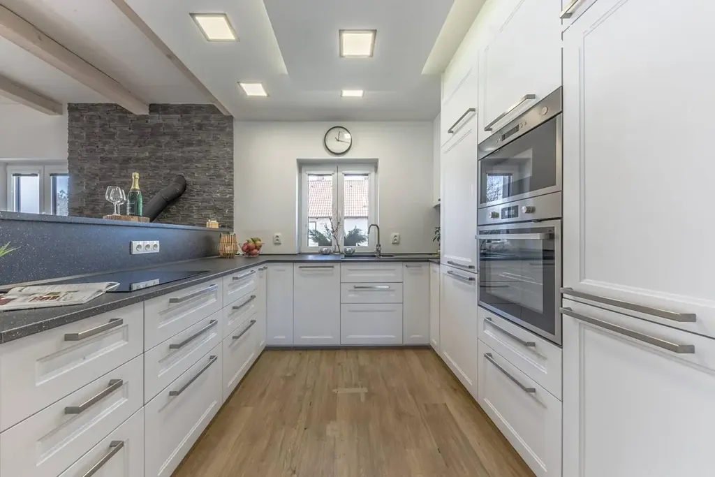 Kuchyňská linka nabízí velkorysé úložné možnosti i vybavení, které ocení každý, kdo rád vaří nebo často hostí návštěvy. Součástí jsou: 2 lednice, 2 mrazáky, horkovzdušná trouba, mikrovlnná trouba, myčka, sklokeramická deska.