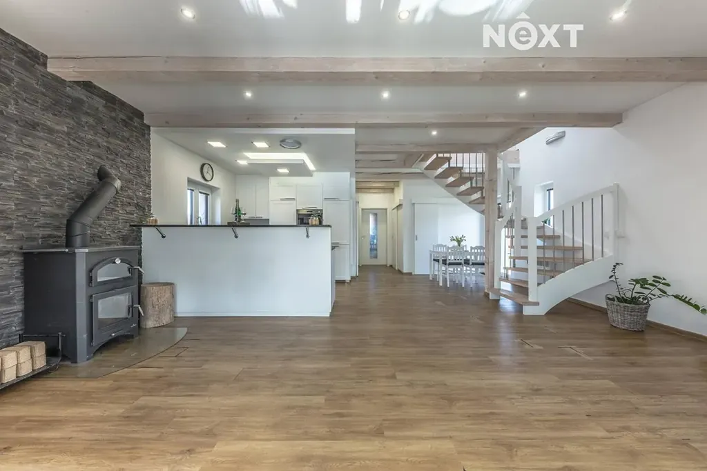 Velký a vzdušný obytný prostor orientovaný do zahrady přes široký HS portál. Centrální prvek? Krbová kamna, která prostor vyhřejí rychle a levně. Podlahy v dekoru dřeva navozují útulnost, schodiště je samonosné dubové.