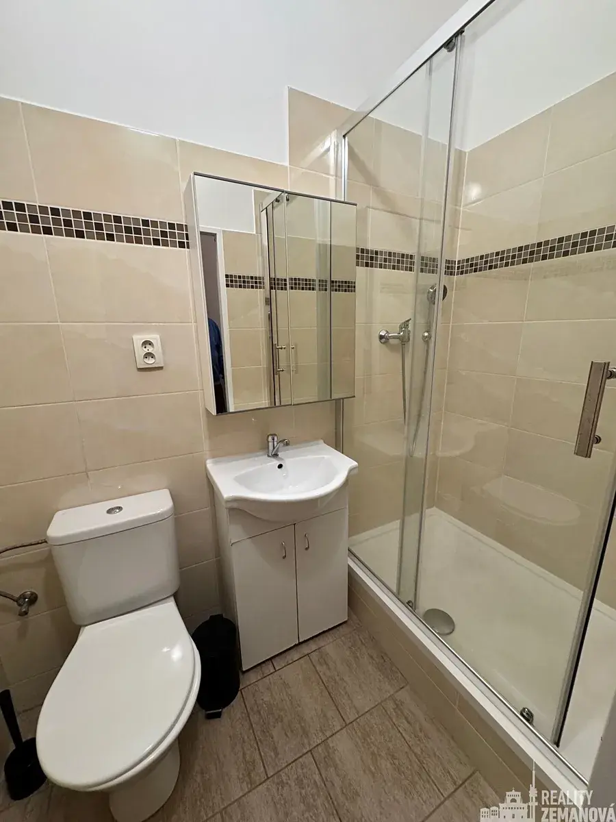 Dispozice bytu: předsíň s oknem orientovaným do klidného vnitrobloku, vybavená automatickou pračkou a bojlerem pro ohřev teplé vody, plynule navazující na kuchyňský kout s pěknou kuchyňskou linkou, elektrickým sporákem, lednicí a bílým jídelním stolem se čtyřmi židlemi. Z kuchyně je vstup do koupelny se sprchovým koutem, umyvadlem a WC a dále do prostorného pokoje orientovaného do Řipské ulice na západ. Pokoj je vybaven bílou skříní (viz foto) a velkou postelí. Vše ve velmi dobrém stavu. Vytápění je zajištěno topidlem WAW.