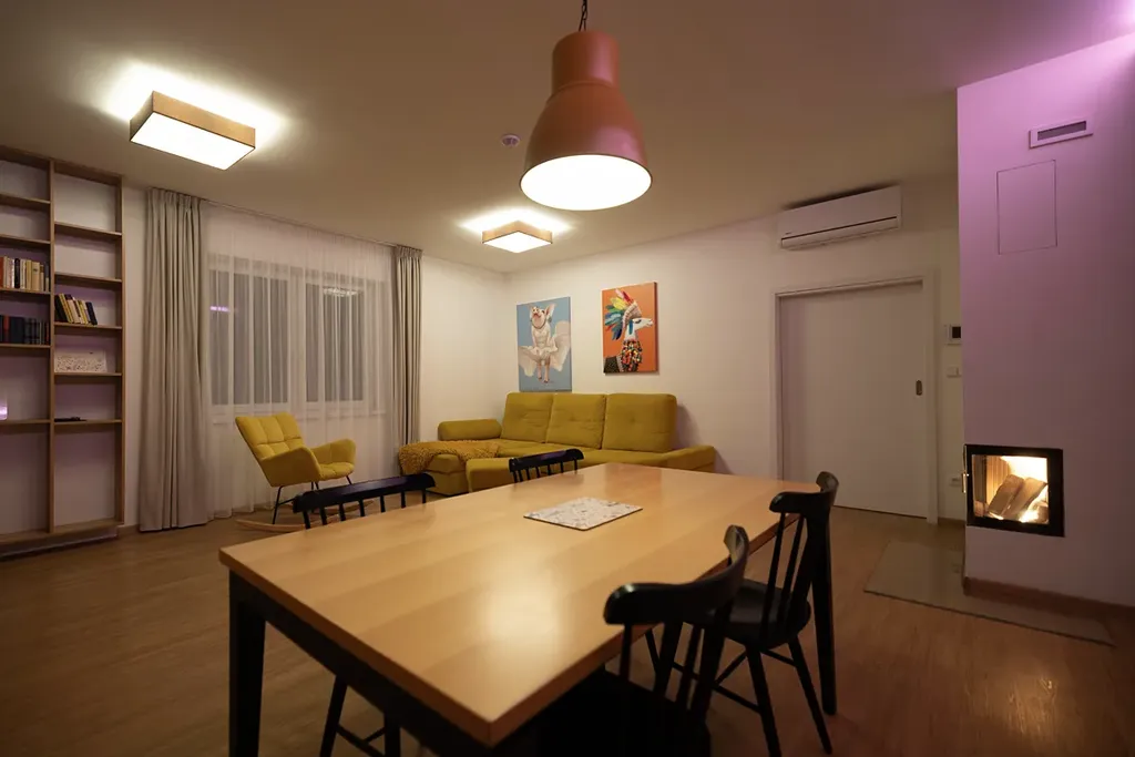 V celém domě je teplovodní podlahové vytápění a hlavní dominantou obývacího pokoje s kuchyní je potom rohový krb značky Hoxter, který vytopí celou obytnou část domu.