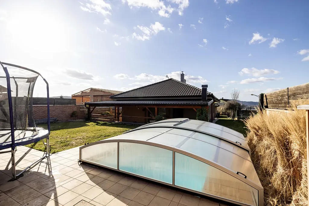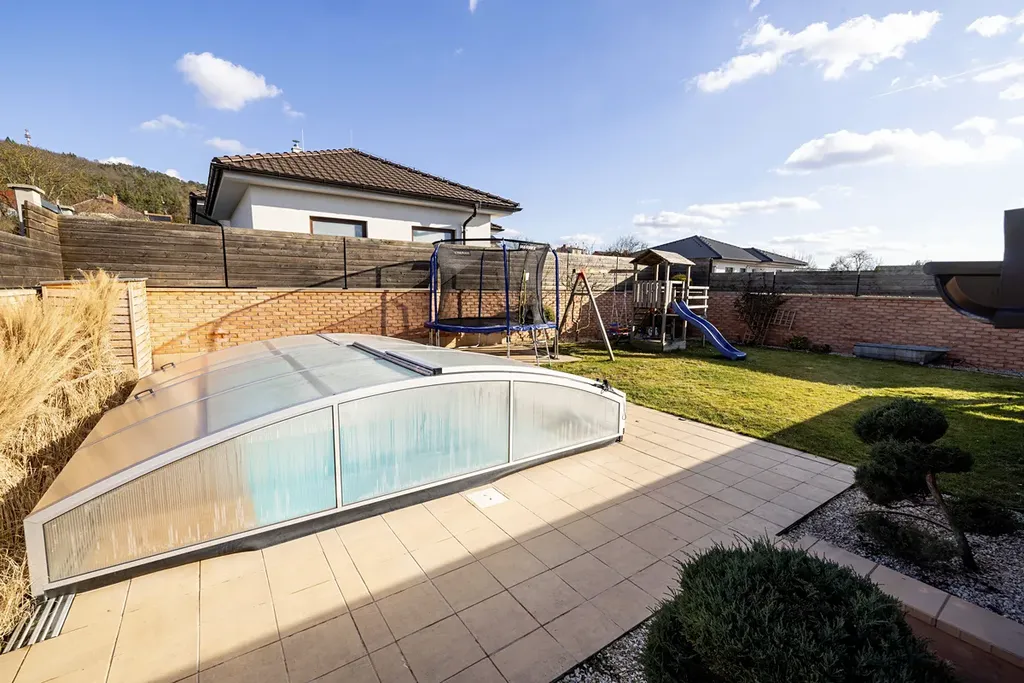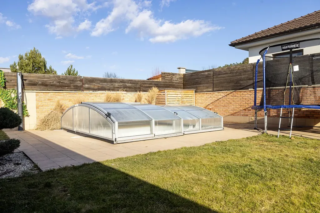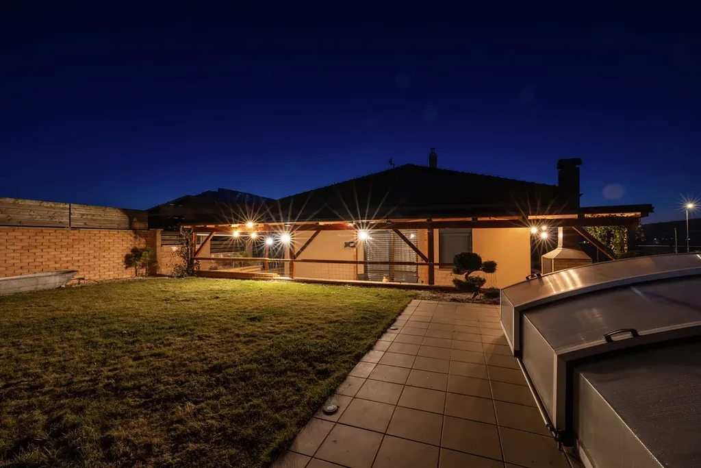 V zadní části okrasné zahrady, která je osvětlená a disponuje závlahovým systémem je bazén se zastřešením a protiproudem.