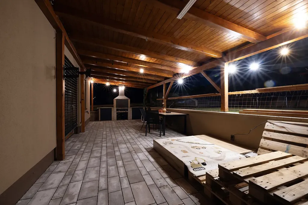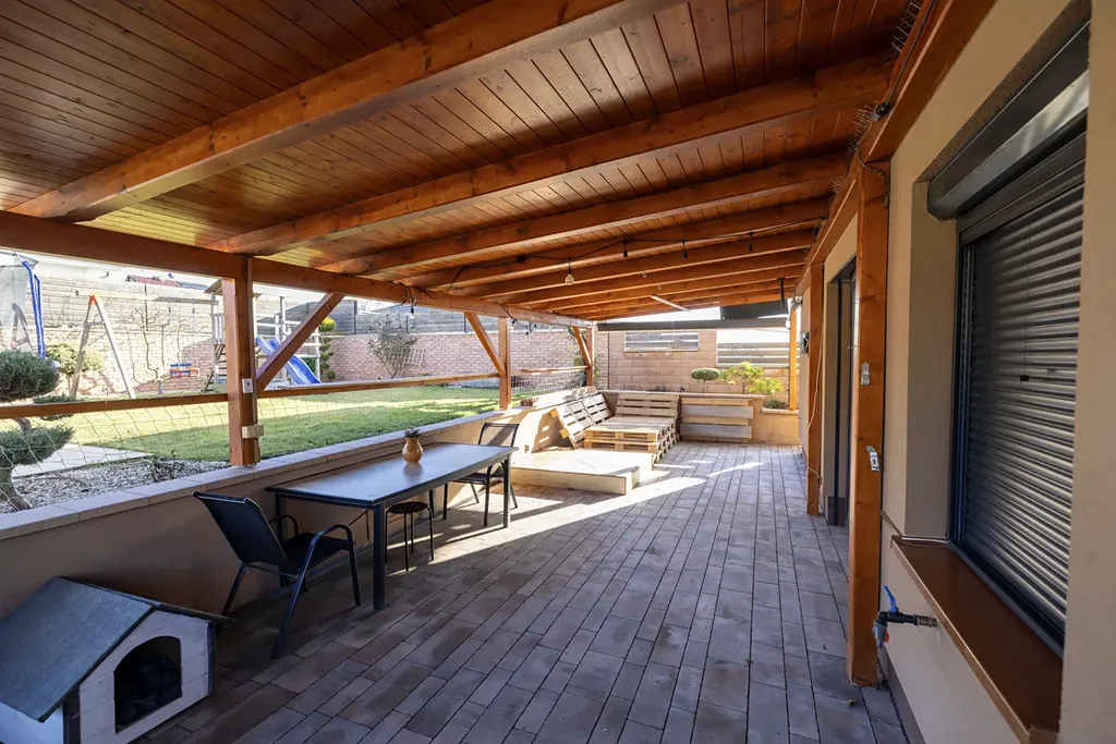 Za domem se nachází velkorysá terasa s pergolou o výměře 36m2, která se po drobné úpravě dá využít i jako celoroční zimní zahrada (viz. Vizualizace). Pod pergolou je kromě příjemného posezení i v horkých letních dnech možnost využívat gril s udírnou z šamotových cihel s pracovními deskami z leštěného kamene.