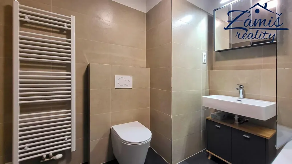 V koupelně si můžete vychutnat koupel ve vaně. Zároveň je zde sprchová zástěna pro rychlou sprchu, umyvadlo se zrcadlem a WC. Pro pračku je připraveno přípojení vody i odpadu.
