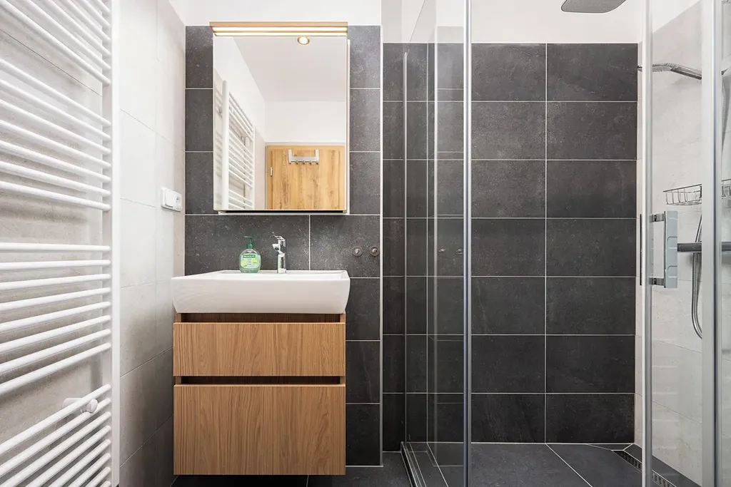 Koupelna s toaletou je prostorná s velkým sprchovým koutem. Je zde také umístěna pračka se sušičkou.