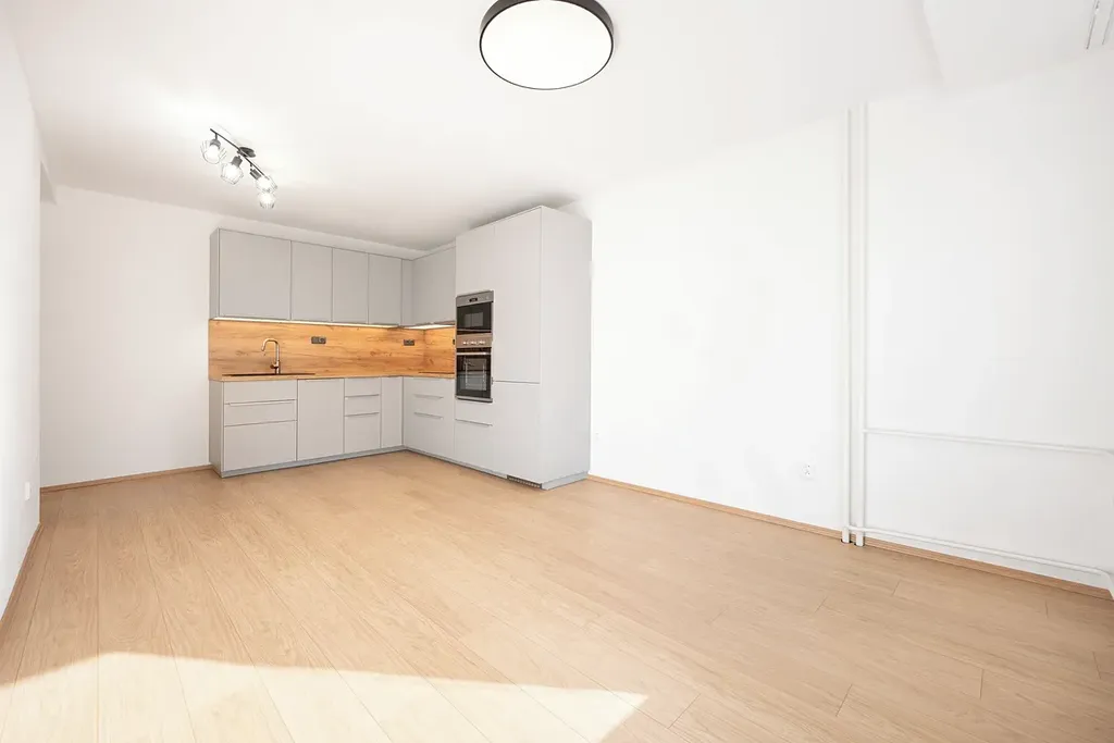 Obývací pokoj s kuchyňským koutem má velmi příjemnou atmosféru. Vejde se zde pohodlně také jídelní stůl i sedací souprava. Kuchyňská linka je nová se všemi potřebnými vestavěnými spotřebiči – indukční varná deska, digestoř, lednice, mrazák, elektrická a mikrovlnná trouba, myčka.