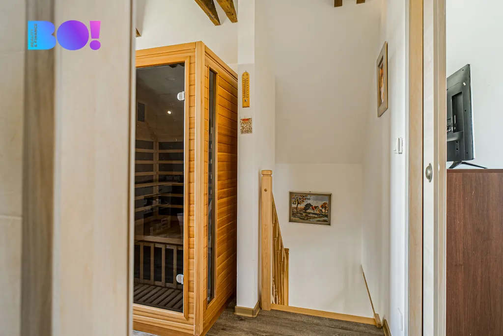 V horním patře je ložnice, otevřený pokoj/pracovna se šatnou a koupelna.