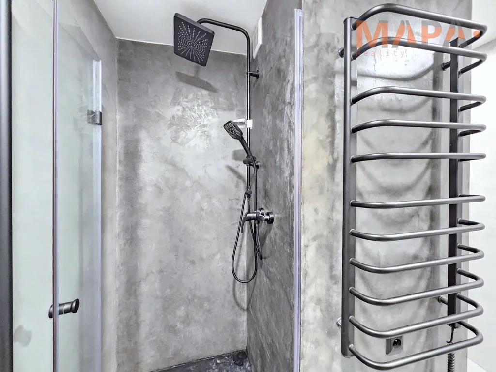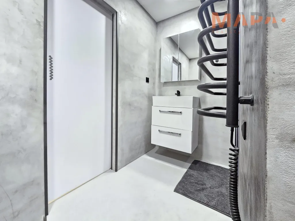 Interiér bytu působí moderně a čistě. Dominantou je nová epoxidová podlaha, která dodává prostoru elegantní vzhled a zároveň je velmi praktická na údržbu. V koupelně a částečně také v kuchyni jsou použity moderní betonové stěrky, které podtrhují současný styl bydlení.