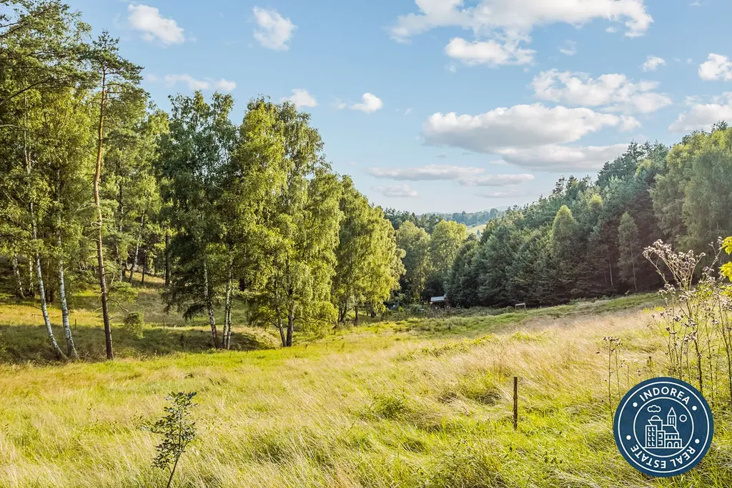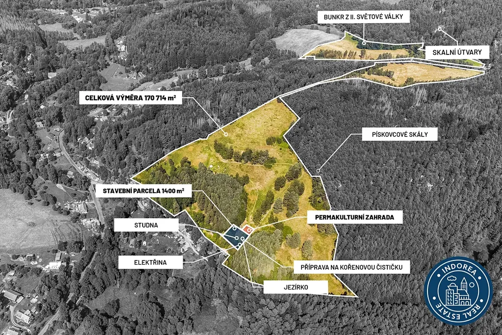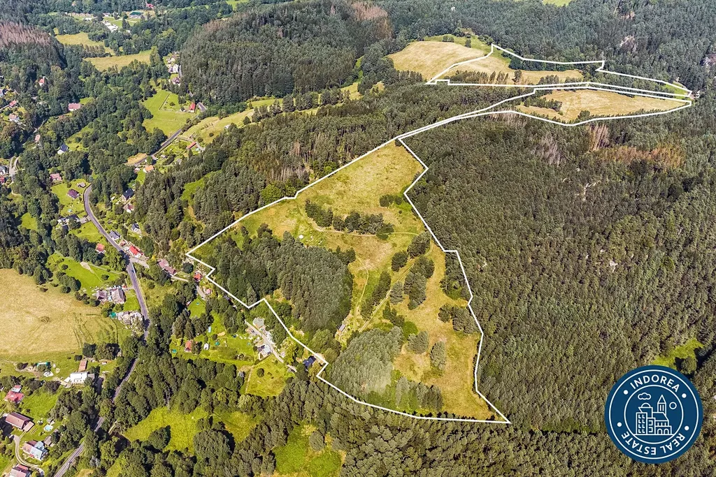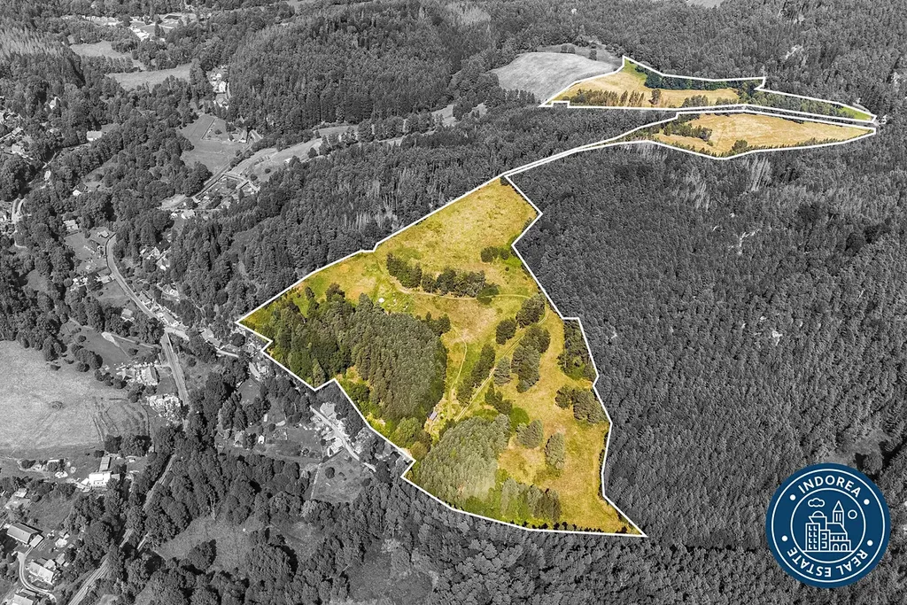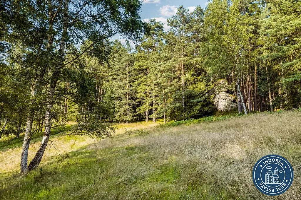 Celková výměra pozemků, které nabízíme činí 170 714 m2 a skládá se z trvalých travních porostů, lesních pozemků a v neposlední řadě ze stavebního pozemku, který má plochu 1400 m2. Na tomto stavebním pozemku je povolena výstavba rodinného domu venkovského typu s jedním nadzemním podlažím a s obytným podkrovím. Je zde nově kopaná studna do hloubky 10 metrů s vodním sloupcem 2 metry, příprava na kořenovou čističku, a elektrická přípojka na hranici pozemku.