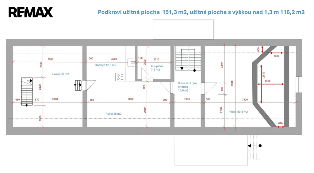 Celková užitná plocha podkroví je přibližně 151 m² (116 m² při výšce nad 1,3 m).