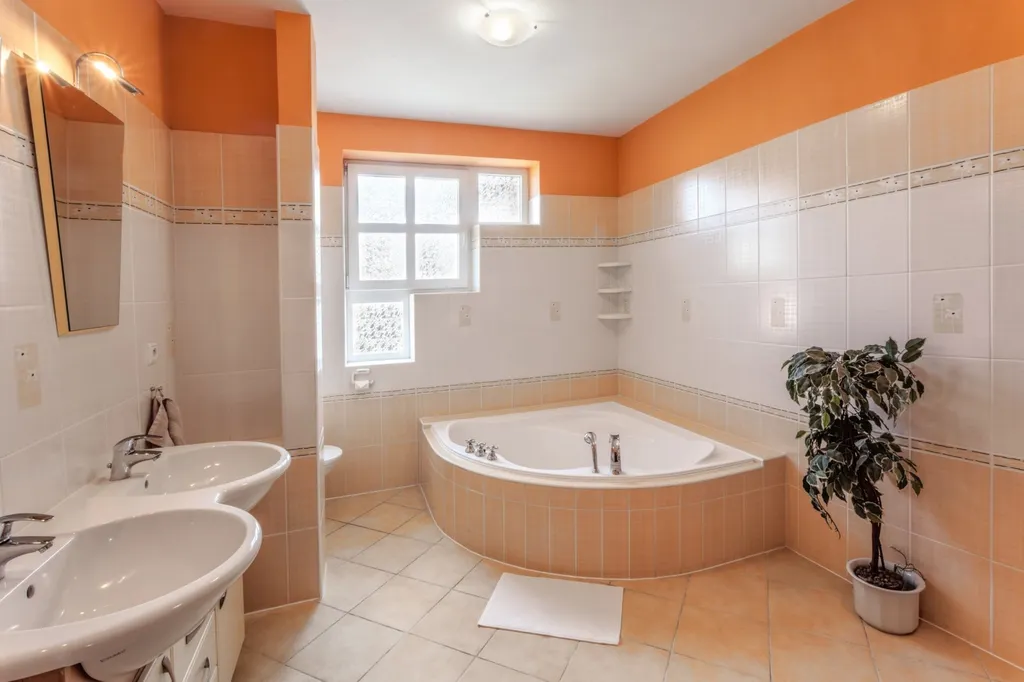 Rodinný dům: předsíň, toaleta, chodba, tři neprůchozí pokoje, koupelna (s rohovou vanou, sprchovým koutem i WC), prostorný obývací pokoj s jídelnou, kuchyň a terasa.