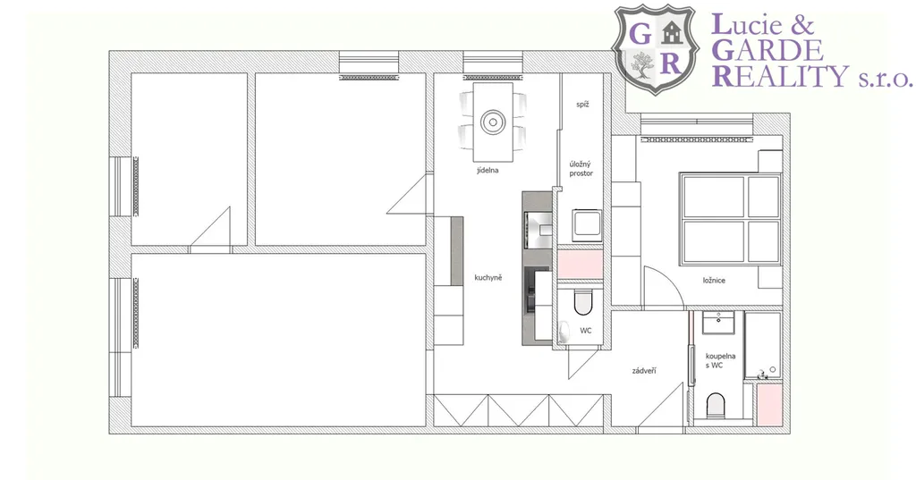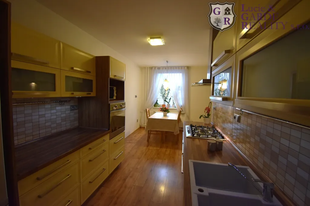 Kuchyně byla důmyslně předělána tak, aby nabídla dostatečný pracovní prostor, jídelní kout, spíž i prostor pro pračku/sušičku. V koupelně se nachází vana a WC, druhé WC je odděleně v chodbě. Ložnice i obývací pokoj byly hlukově upraveny "předstěnou". V chodbě se nachází velkorysý úložný prostor ve vestavěných skříních. Podlahy - lepený vinyl, v koupelně a na WC dlažba. Nové obložky, dveře a veškeré rozvody elektřiny i vody a odpadů. Z obývacího pokoje vejdete do prostorné lodžie, kde si v klidu vypijete svůj šálek kávy nebo čaje.