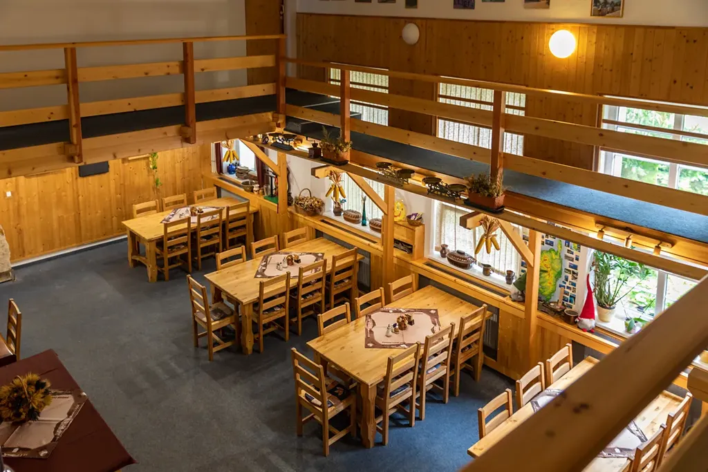 Cihlová budova je třípatrová. Nachází se zde restaurace s kuchyní, ubytování se 40 lůžky, možné jsou přistýlky. Pro relaxační a sportovní vyžití slouží posilovna, kulečníkový sál, sauna. K dispozici jsou garáže, další parkování je možné přímo na pozemku.