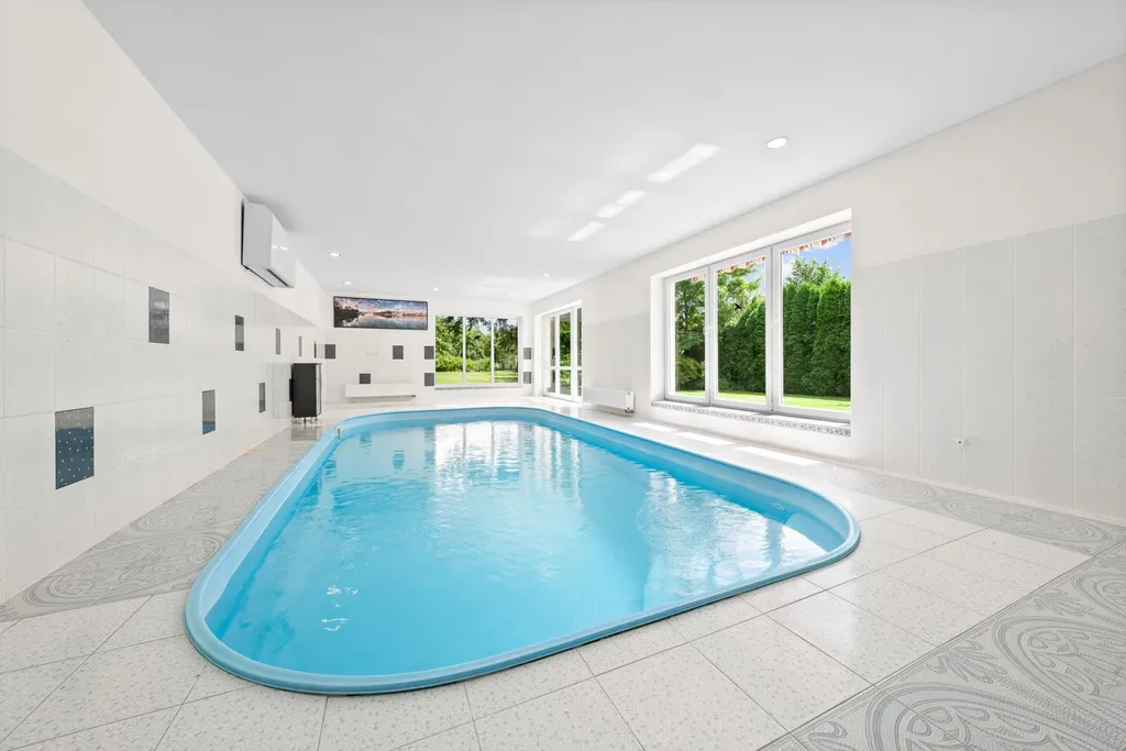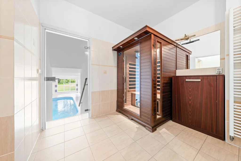 Dominantou domu je komfortní relaxační zázemí s vnitřním bazénem (s protiproudem) a saunou. Součástí je také velkorysá, slunná zahrada s příjemným posezením.