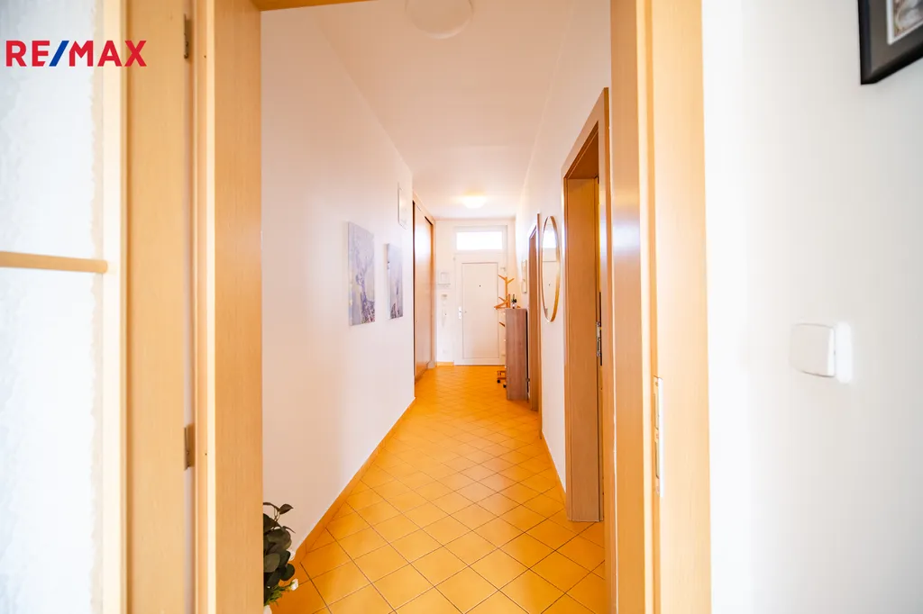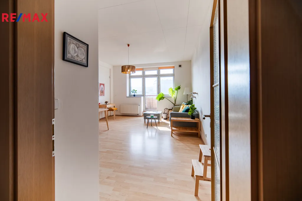 Dominantou bytu je světlý obývací pokoj s kuchyňským koutem a jídelní částí o velikosti téměř 30 m², který poskytuje příjemný prostor pro každodenní život i setkávání s přáteli.