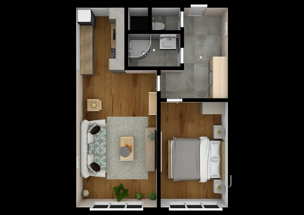 Byt tvoří, předsíň s vestavěnou skříní, obývací pokoj, kuchyň s kuchyňskou linkou vybavenou spotřebiči (lednička, el. sporák, el. trouba, digestoř, pračka), ložnice, koupelna se sprchovým koutem, oddělená toaleta.