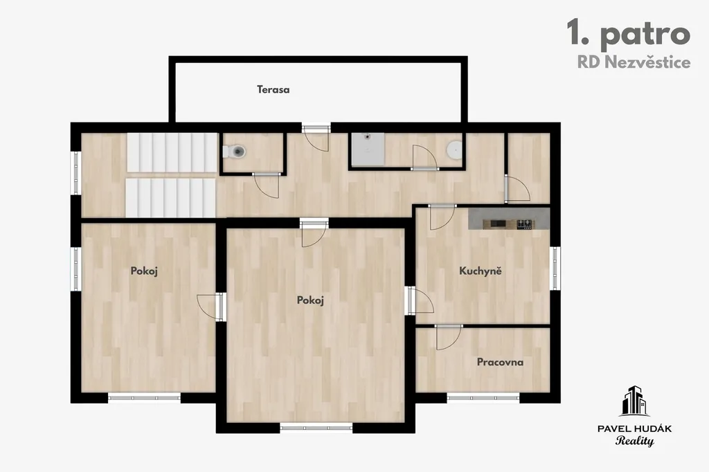 V prvním patře je druhý byt o dispozici 2+1, doplněná o pracovnu, koupelnu, samostatné WC a sklad. Z tohoto podlaží je zároveň přístup na terasu.