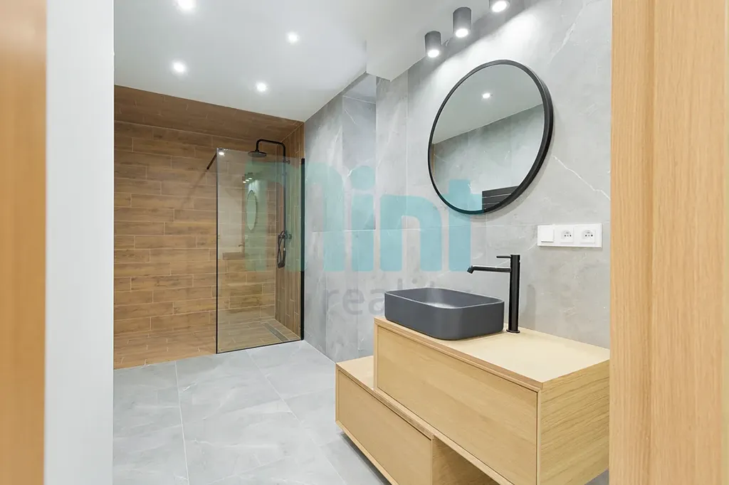 Hlavními přednostmi této nemovitosti jsou rohový balkon a prostorná kuchyňská linka vybavená kvalitními vestavěnými spotřebiči, jako je elektrická varná deska, elektrická trouba, mikrovlnná trouba, lednice a digestoř. Koupelna, zařízená v elegantní barevné kombinaci šedé s dekorem dřeva, nabízí sprchový kout a moderní umyvadlovou skříňku. Toaleta je samostatná, což zajišťuje větší komfort.