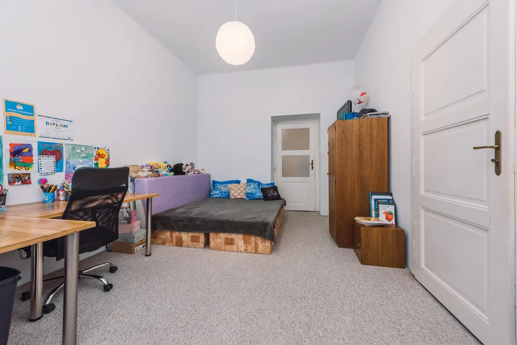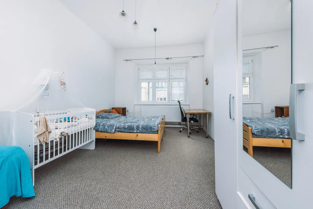 Samostatné neprůchozí a světlé pokoje, v jednom pokoji se nachází malá komora/šatna s oknem.