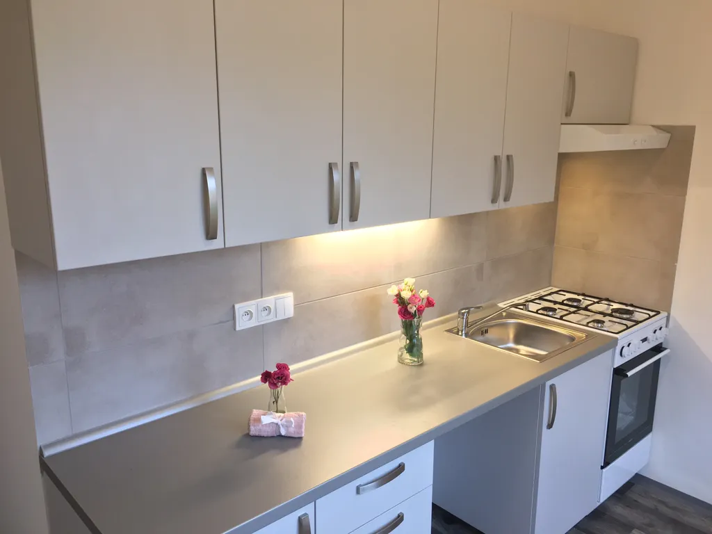 Kuchyňská linka je opatřena plynovým sporákem a elektrickou troubou s možností připojení pračky.