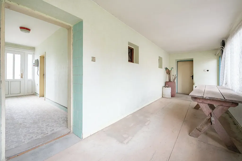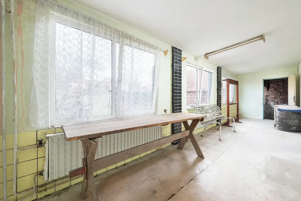 K hlavnímu vchodu domu vede malá oplocená předzahrádka. Po vstupu do chodby se vpravo nachází pokoj o výměře 20,6 m², vlevo kuchyně o velikosti 17,1 m². Z kuchyně je přístup do koupelny (3,66 m²), případně lze pokračovat do ložnice (20,6 m²). Chodbou projdete na prostornou prosklenou verandu (23 m²) s výhledem do dvora. Z verandy vedou dveře vpravo do průjezdu, vlevo pak do druhého, zastavěného křídla domu. To tvoří tři technické místnosti propojené prosklenou chodbou: první (12,2 m²), pravděpodobně využívaná ke zpracování masa, druhá (7,4 m²) s původním plynovým kotlem a třetí (13 m²) sloužila jako sklad. Na konci chodby se nachází samostatné WC (1,5 m²). Odtud se dále prochází na dvůr, kde se nachází chlév (12,6 m²) a prostorná zastřešená kůlna s udírnou.