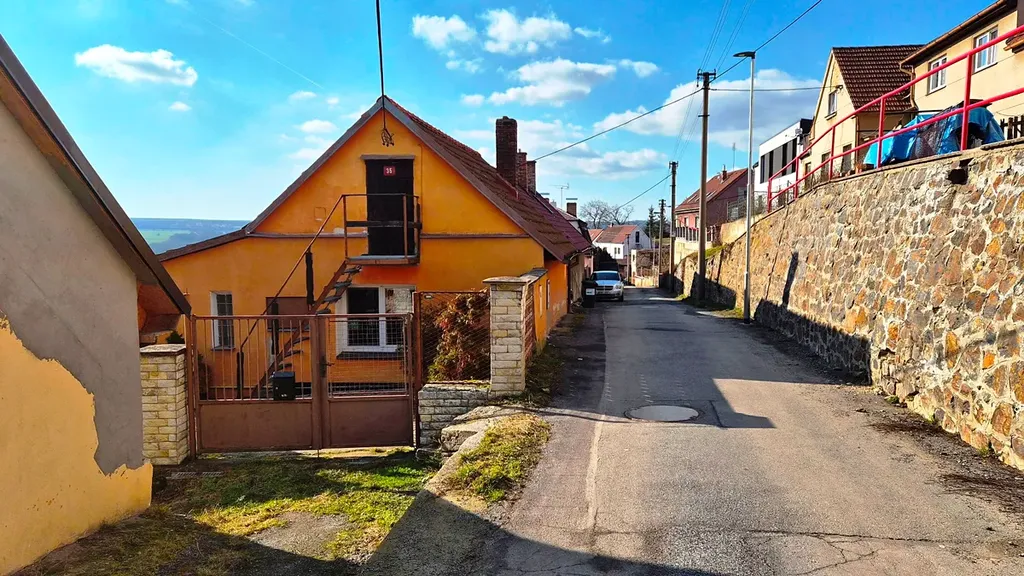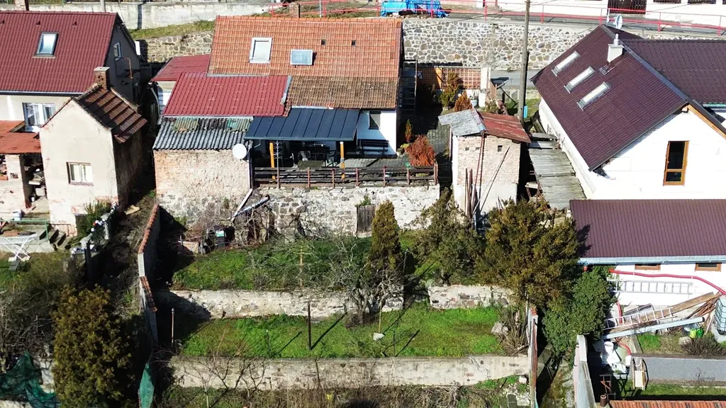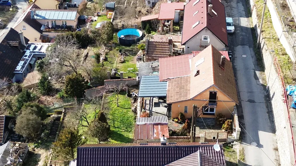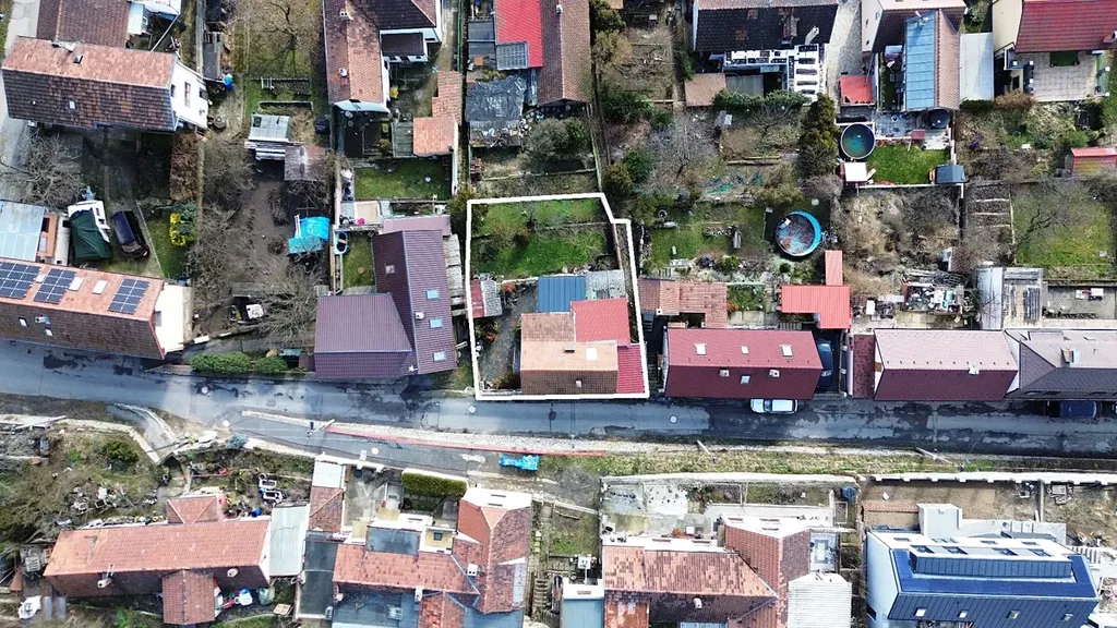 Vlastní pozemek 319 m2, zastavěná plocha domu 85 m2, užitná plocha 50 m2. Kompaktní a dobře stavebně vyřešený pozemek. Dům je v rovině s přístupem z ulice, zahrada je pak kaskádovitá ve dvou úrovních s jižní orientací. Parkování vozidla je možné pouze pod přístřeškem navazujícím zezadu na dům (pouze kompaktní vozidla), na dvůr lze vjet pouze jednostopým vozidlem. Vzhledem k úzké ulici nelze jinak v blízkosti domu parkovat.
