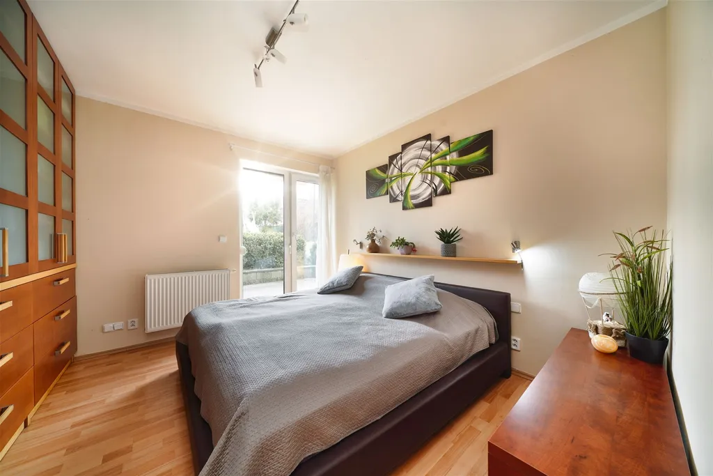 Dispozice bytu je řešena maximálně prakticky a ocení ji jak rodina, tak pár, který hledá komfortní a útulné bydlení. Hlavním prostorem je světlo zaplavený obývací pokoj s jídelnou a kuchyňským koutem, ze kterého vstoupíte přímo na terasu orientovanou do zahrady. Dále zde najdete dvě neprůchozí ložnice, velmi prostornou koupelnu s vanou i sprchovým koutem, samostatné WC a velkou předsíň s vestavěnými skříněmi.