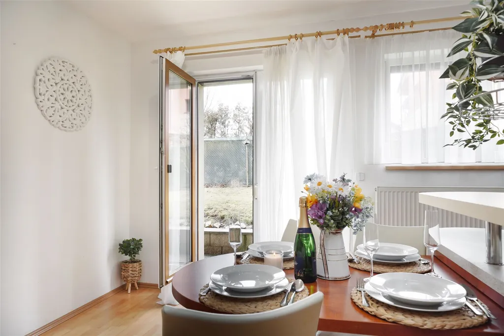Byt působí čistě, útulně a nabízí dostatek úložných i obytných prostor. Terasa navazující na zahradu poskytuje příjemné soukromí a skvělé místo pro posezení, relax, hraní dětí nebo letní grilování. Obyvatelé domu mohou využívat i venkovní bazén situovaný přímo na zahradě.