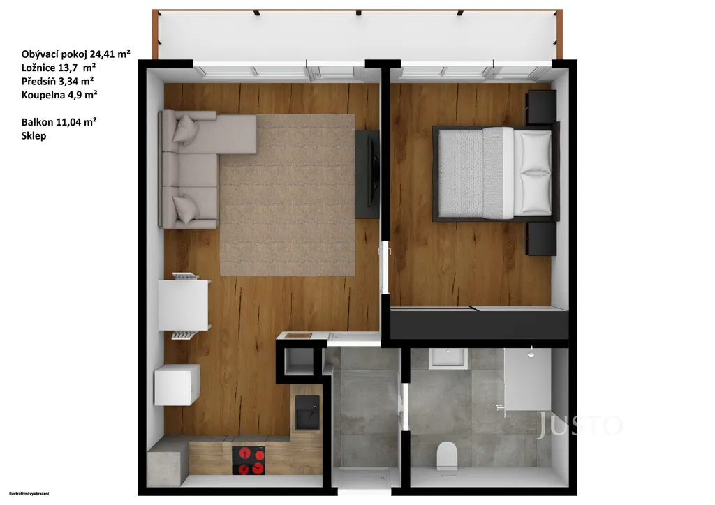 5. Prostorný balkon (11 m²), na který se dostanete jak z obývacího pokoje, tak z ložnice.