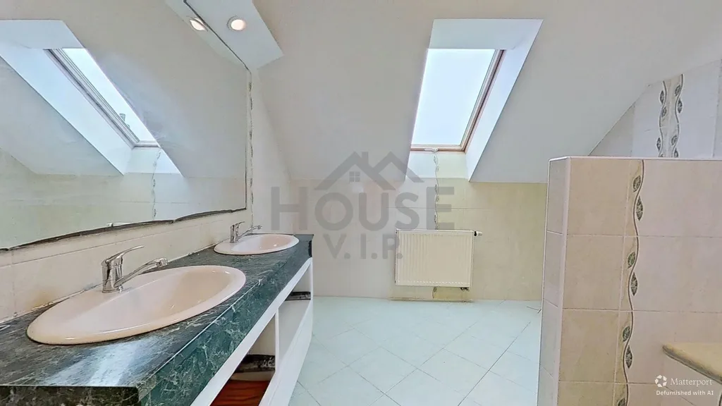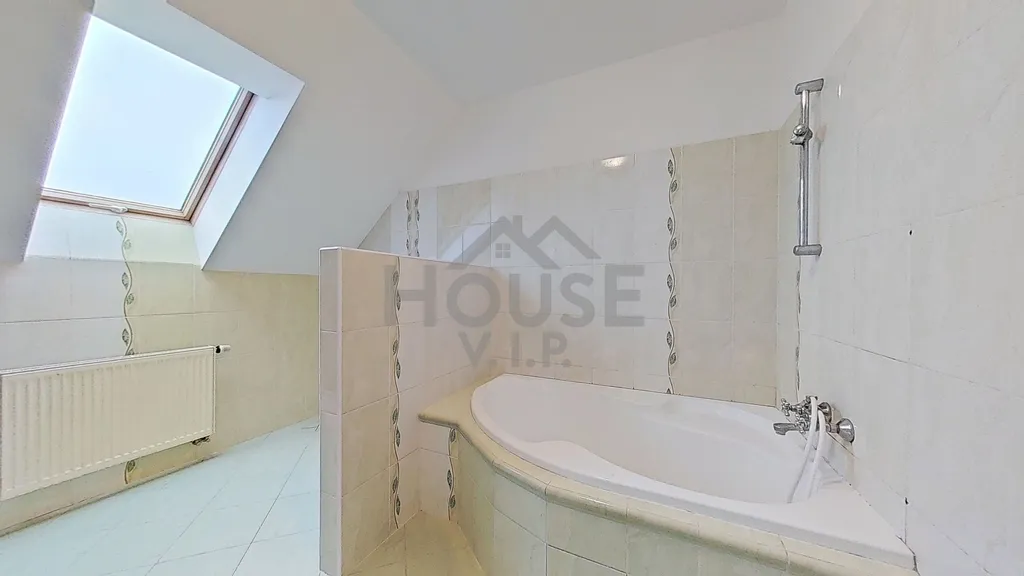 V prvním patře se nachází koupelna se sprchovým koutem, rohovou vanou a toaletou a dále tři samostatné pokoje, z nichž jeden je vybaven vestavěnou rohovou skříní. Druhé patro (podkroví) nabízí velkorysý pokoj se šikmými stropy, který může sloužit například jako ložnice, pracovna nebo herna. Dům je ve velmi dobrém technickém stavu, nicméně nový majitel může počítat s drobnými úpravami dle vlastních představ – zejména s výměnou podlahových krytin v obývacím pokoji a v podkrovním pokoji a případnou modernizací kuchyňské linky. Energetický štítek se vyhotovuje, proto zatím uvádíme "G".
