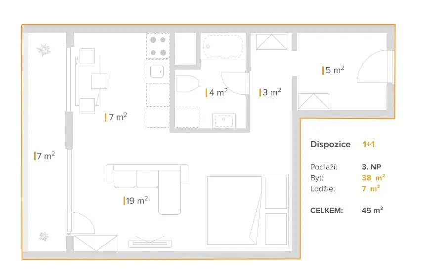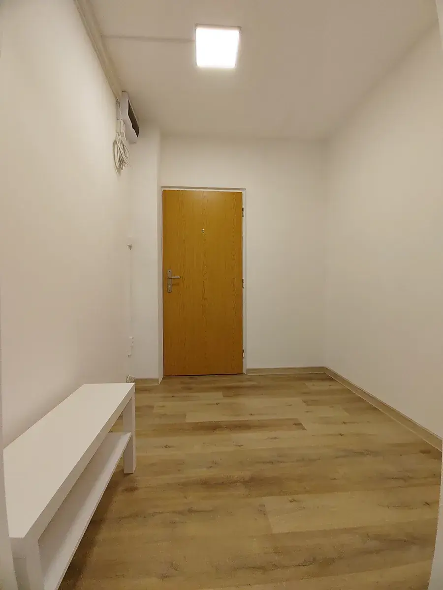 V bytě je postel, stůl židle a drobný nábytek, který není na fotografiích. Byt můžu dovybavit třeba o pračku nebo gauč.