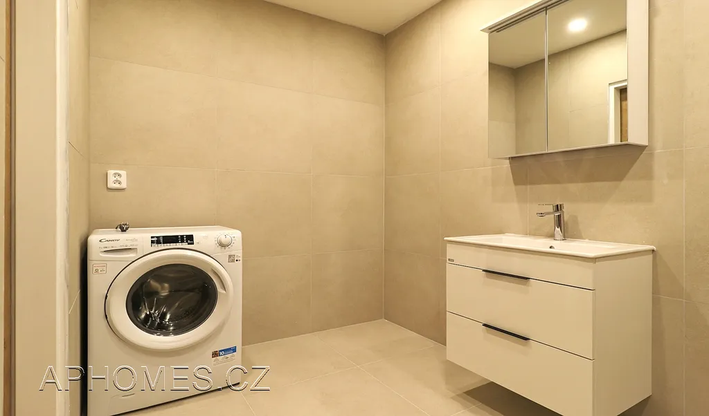 Pračka je umístěna v koupelně.