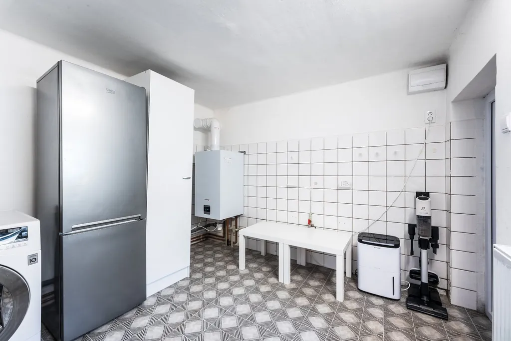Na pozemku se nachází nebytové prostory (garáž/hala) o celkové ploše 85m², které tvoří významnou část této nabídky. Výhodou této stavby přístupné z hlavní komunikace je možnost průjezdu na pozemek za domem (zahradu). Je zde samostatný elektroměr, vodoměr a také několik elektrických zásuvek na 230V i 380V. To umožňuje široké spektrum využití těchto prostor. Menší autodílna, výrobní prostory, sklad nebo něco úplně jiného – to již bude závislé na podnikatelském záměru budoucího majitele. V současnosti byly prostory pronajaty s pravidelným výnosem zhruba 15 tisíc Kč měsíčně.