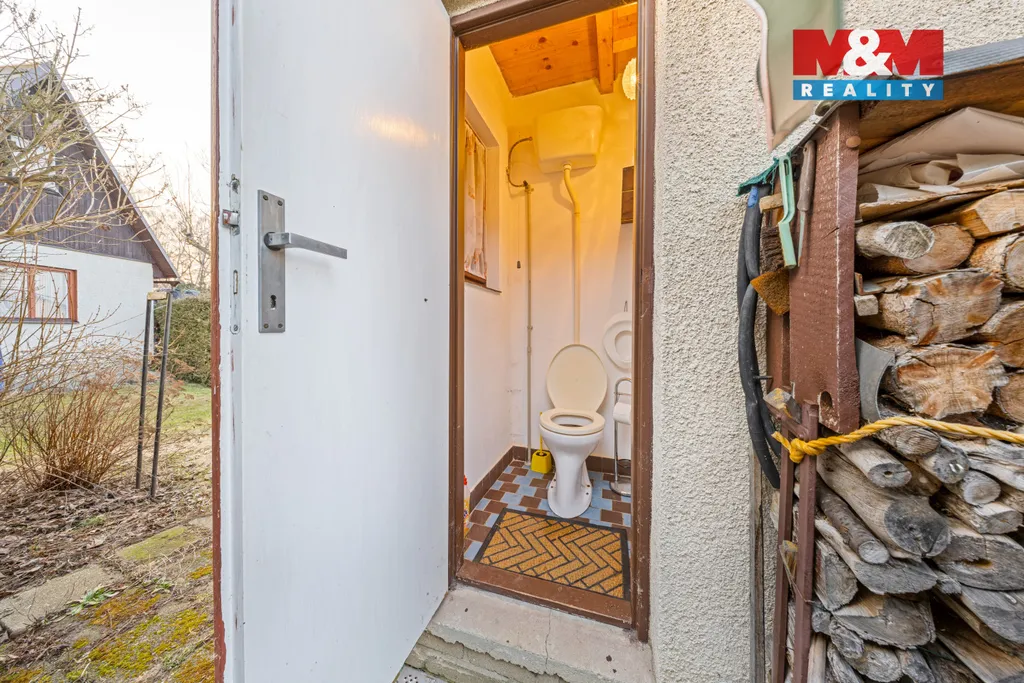 Chata částečně podsklepená – sklep má přibližně 12 m² a nabízí praktický úložný prostor. Nemovitost disponuje vlastním WC. Objekt je napojen na užitkovou vodovod, odpad je řešen pomocí septiku (žumpy).
