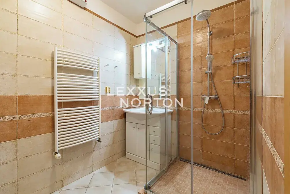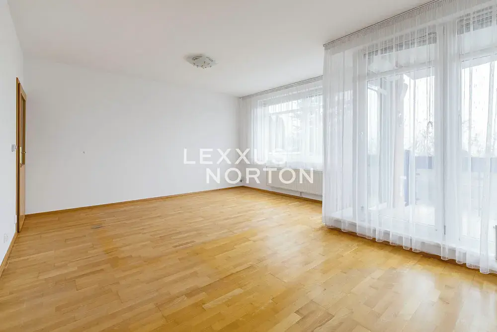 Obývací pokoj s kuchyňským koutem tvoří srdce bytu – je světlý, prostorný a má vstup na terasu a zahradu, která je o několik schodů níže než byt samotný. Na zahradě je pergola, sprchový kout a případně dostatek místa i pro umístění vířivky.