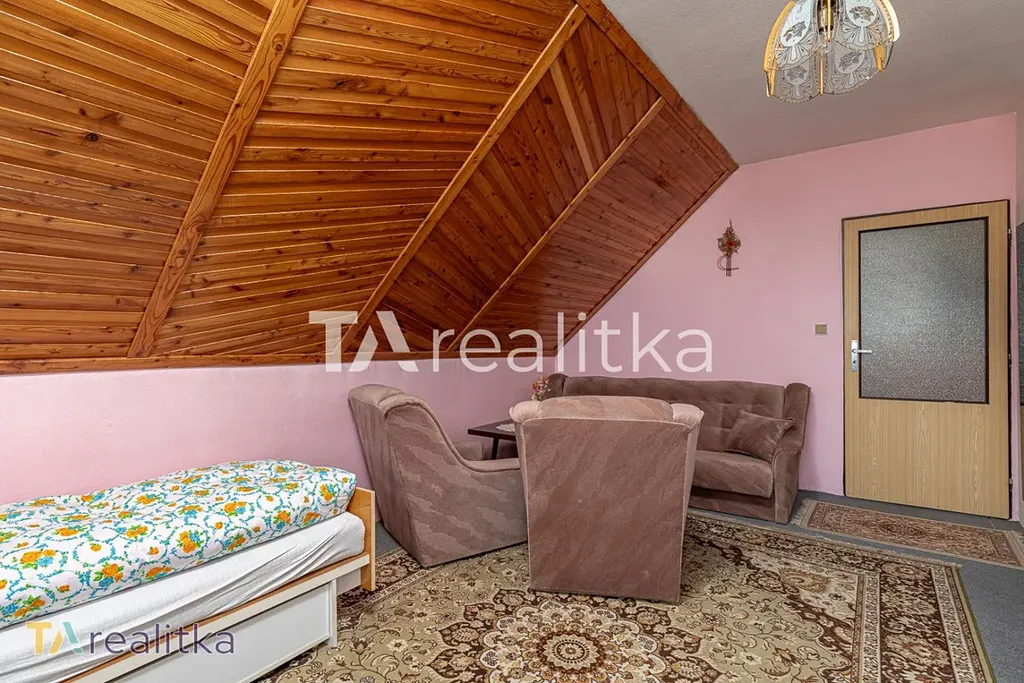 V patře jsou tři samostatné pokoje a koupelna s WC. Největší pokoj disponuje balkonem a díky své velikosti zde lze vytvořit prostorný obývací pokoj s kuchyňským koutem.