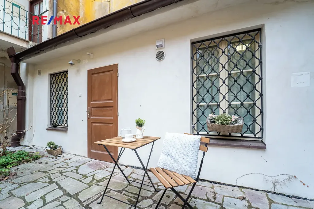 Velkou předností bytu je také přímý vstup do klidného vnitrobloku domu, kde je možné využívat příjemné posezení, ideální pro relaxaci či trávení času v soukromí mimo ruch historického centra.