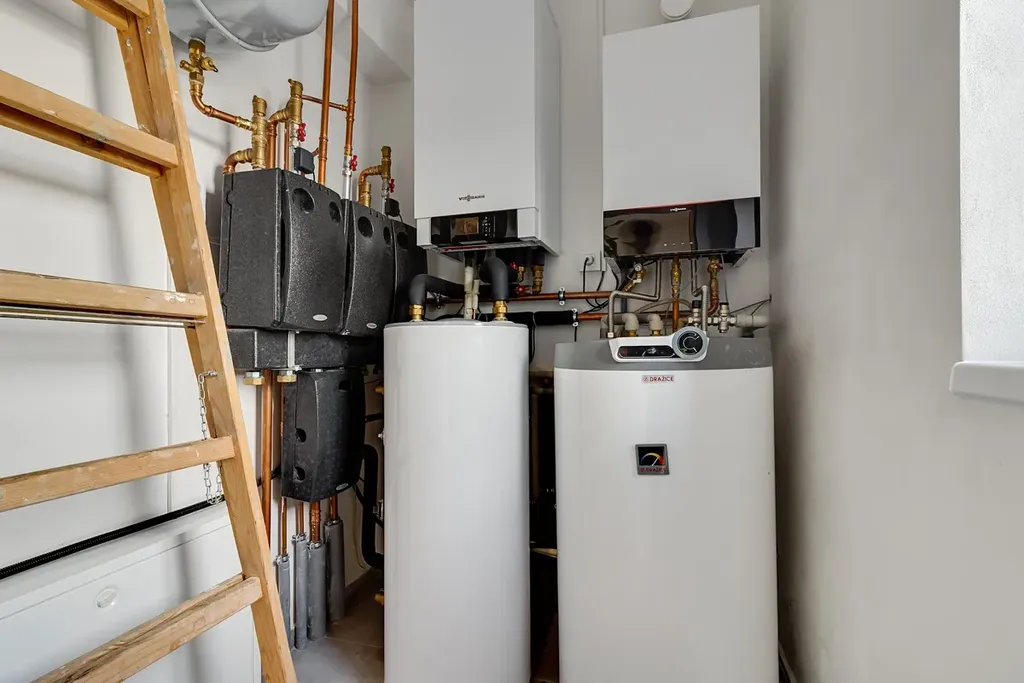 Obě budovy mají oddělené měřiče médií a jsou samostatně vytápěny kombinací tepelného čerpadla a plynových kotlů VIESSMANN s dálkovou regulací. Atmosféru i tepelnou pohodu doplňují v obou objektech krbová kamna. Dům dle předloženého PENB, splňuje energetickou třídu D.