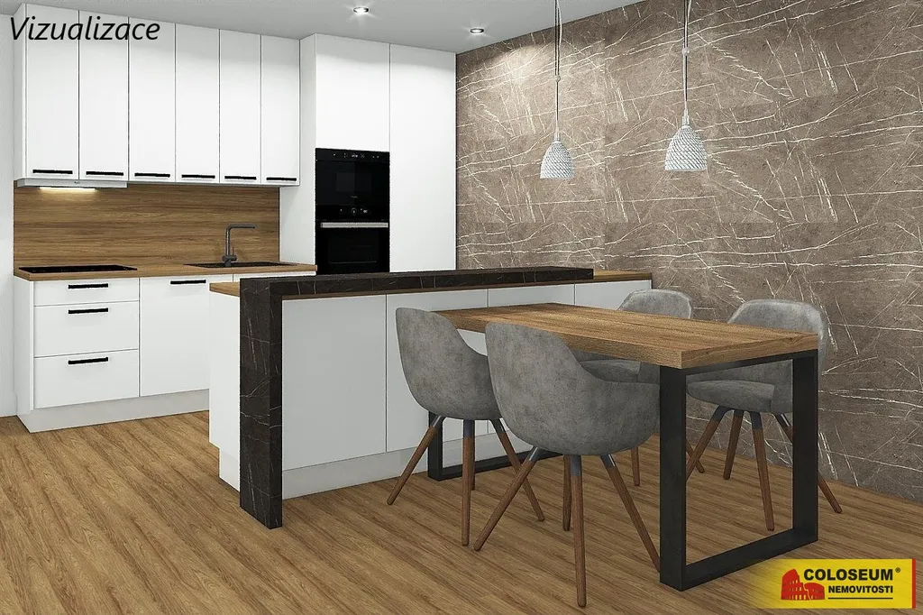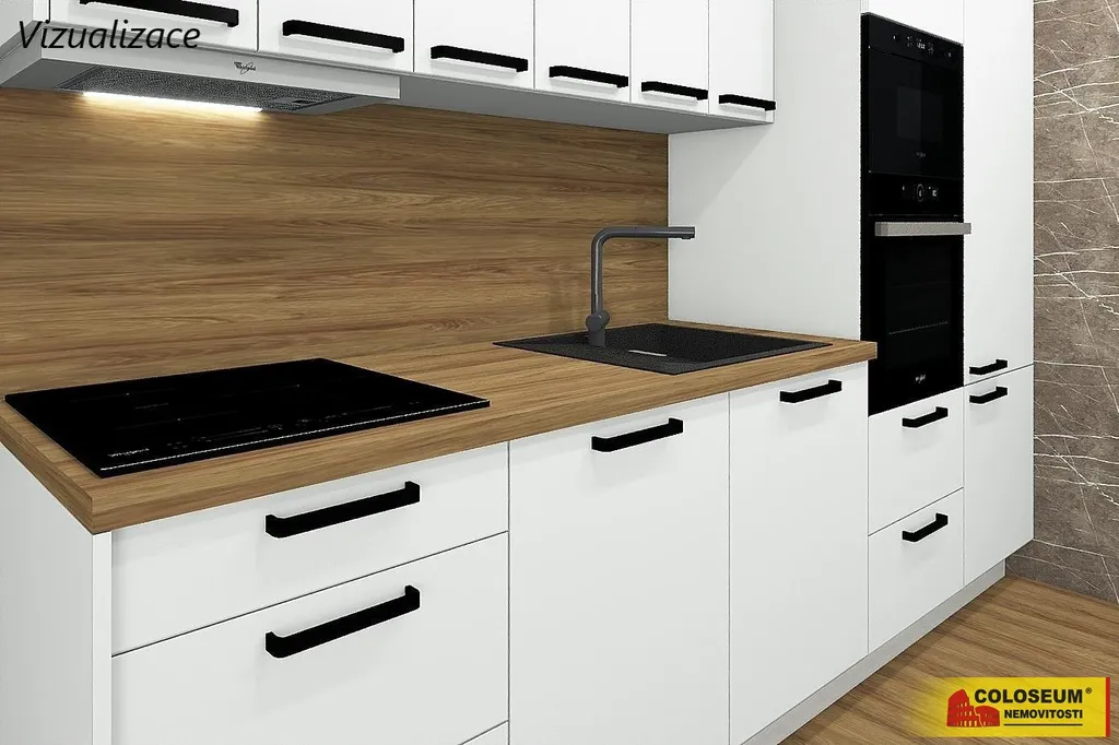Velkou výhodou je, že v ceně domu je zahrnuta kuchyňská linka s možností výběru barvy, přičemž budoucí majitelé mají také možnost výběru podlah, dlažby i obkladů dle vlastních preferencí. V inzerci jsou použity vizualizace, které slouží pro lepší představu o možném budoucím designu kuchyně a obytného prostoru.