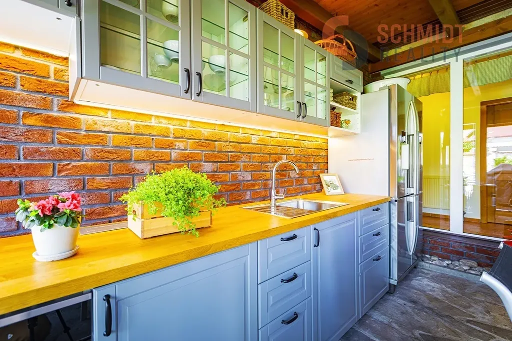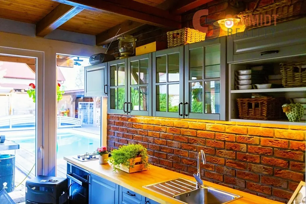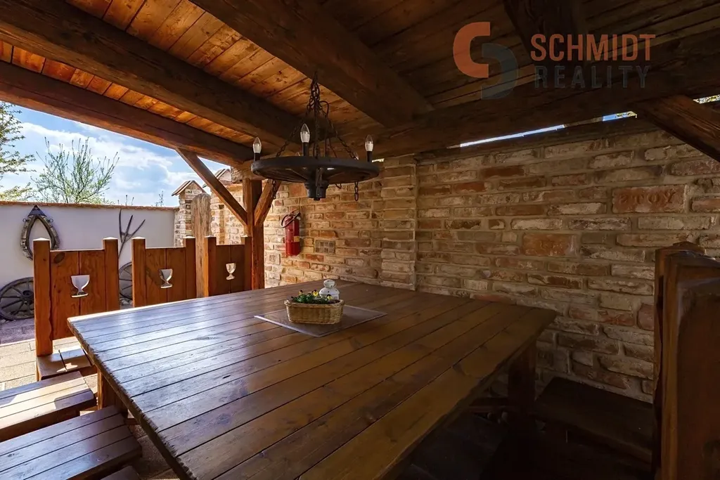 Dům nabízí světlý obývací pokoj s krbem, který plynule navazuje na jídelní část a kuchyni. Dispozice dále zahrnuje tři samostatné ložnice, koupelnu, samostatné WC a technickou místnost. Ze vstupní části domu je přístup do prostorné zimní zahrady s kompletním kuchyňským zázemím, která je ideálním místem pro posezení s rodinou a přáteli po celý rok. Na upravené zahradě se navíc nachází krytý bazén. Parkování je zajištěno krytým stáním vedle domu, které je přístupné přes elektricky ovládanou bránu.