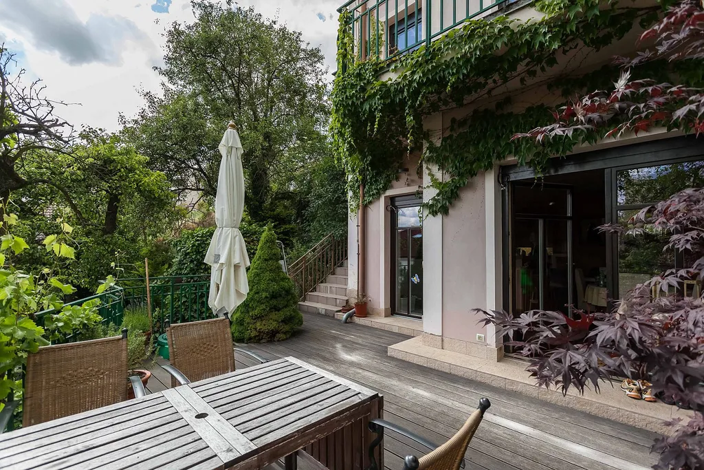 Dům s malou zahradou a terasou porostlou břečťanem s výhledem do zeleného svažitého dvora. Dům z roku 2001, který prošel v roce 2010 rekonstrukcí, nabízí díky své příznivé jihovýchodní orientaci dostatek příjemného přirozeného světla.