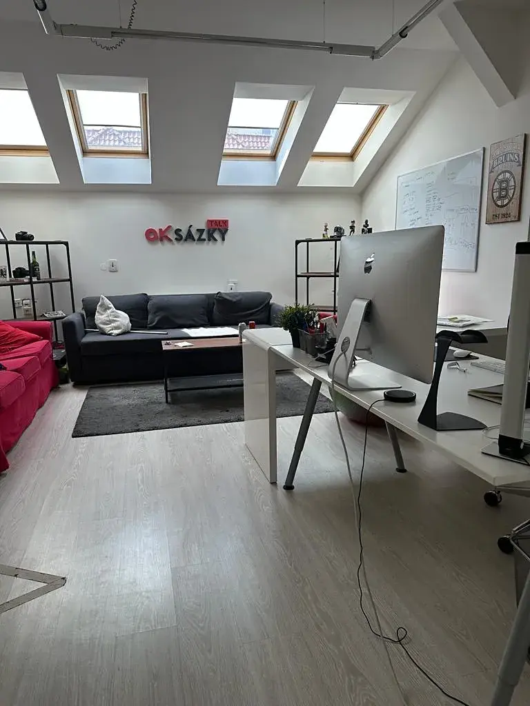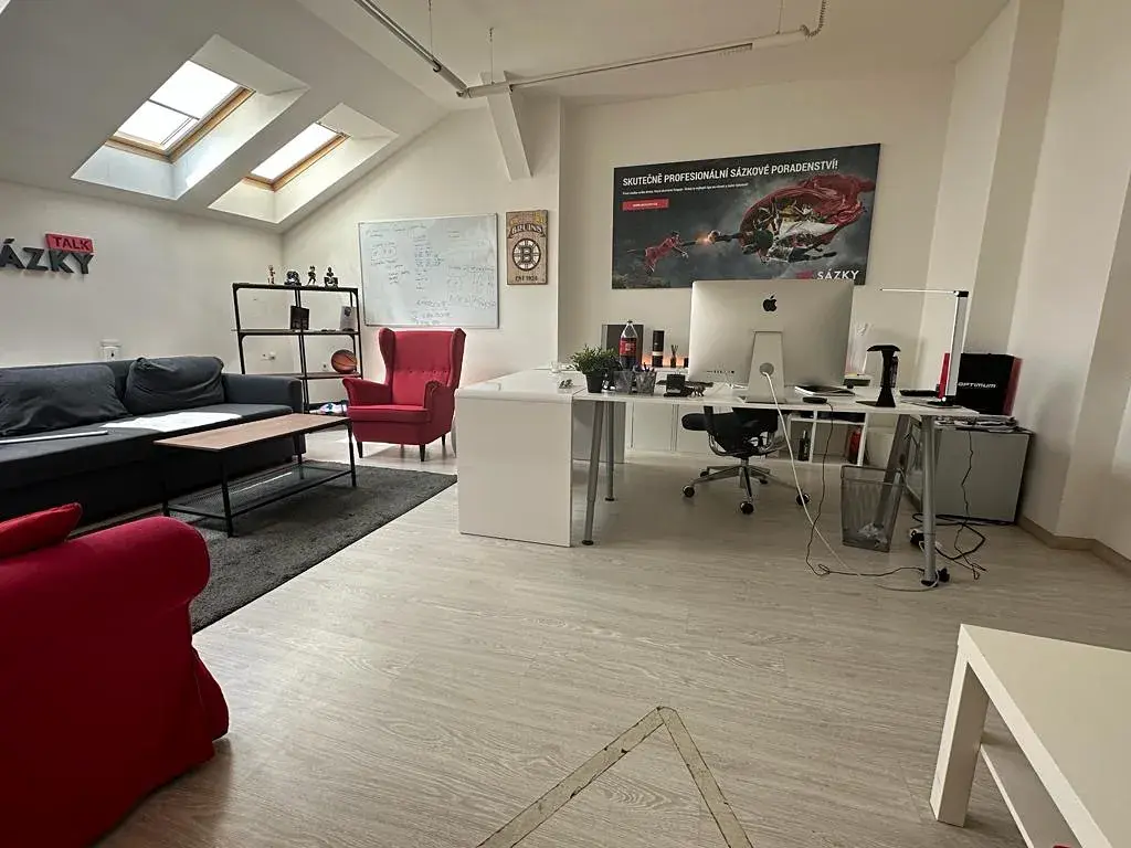 Dispozičně se jedná o 4 podkrovní kanceláře o velikosti cca 85m2, 4 . patro s výtahem, cihlovém domě, který je reprezentativní. Prostory jsou klimatizované a vybavené střešními okny.