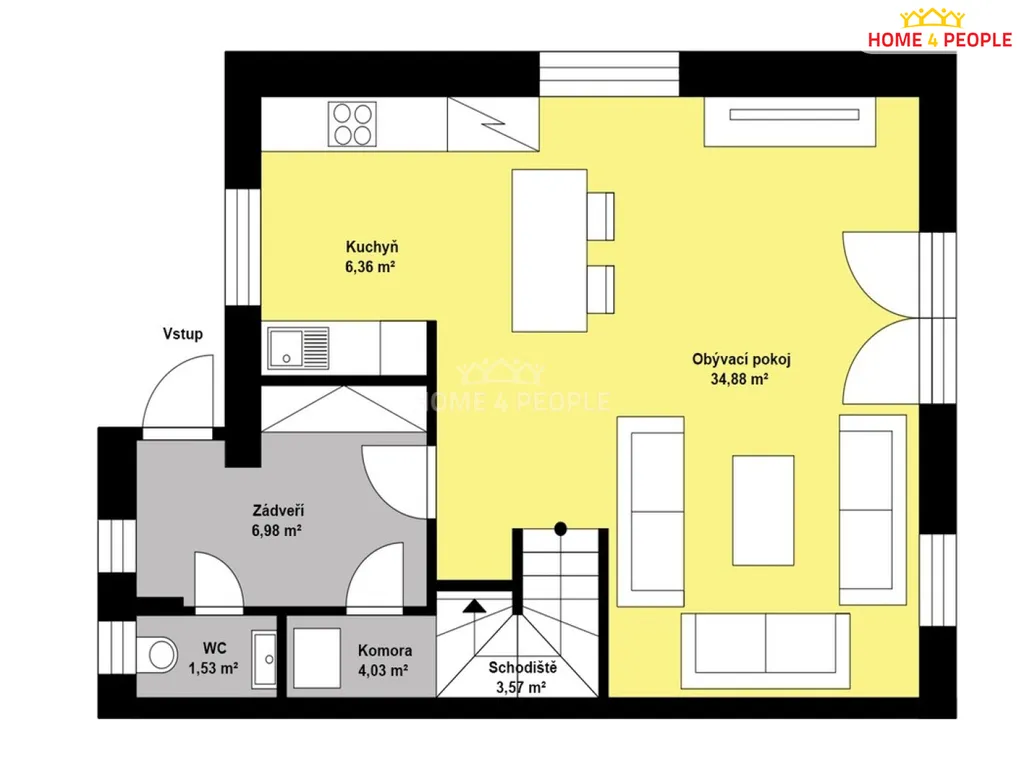 V přízemí je chodba, kde je samostatné WC a technická místnost se sprchovým koutem. Dále jsou zde vestavěné skříně. Obývací pokoj (36,50 m²) s kuchyní a jídelním ostrůvkem (6,76 m²) s technistonem z roku 2025 tvoří hlavní místnost domu. Kuchyně je zařízená kombinovanou troubou s mikrovlnkou značky Gorenje, plynovým sporákem Bosch, ledničkou Gorenje a vestavěnou vinotékou Philco. Na podlaze je dlažba s vytápěním.