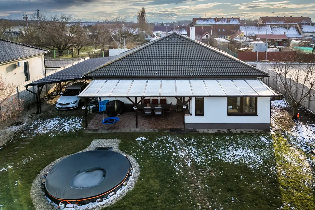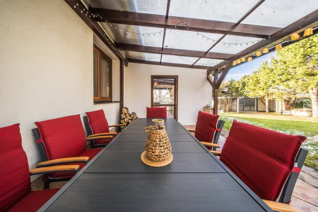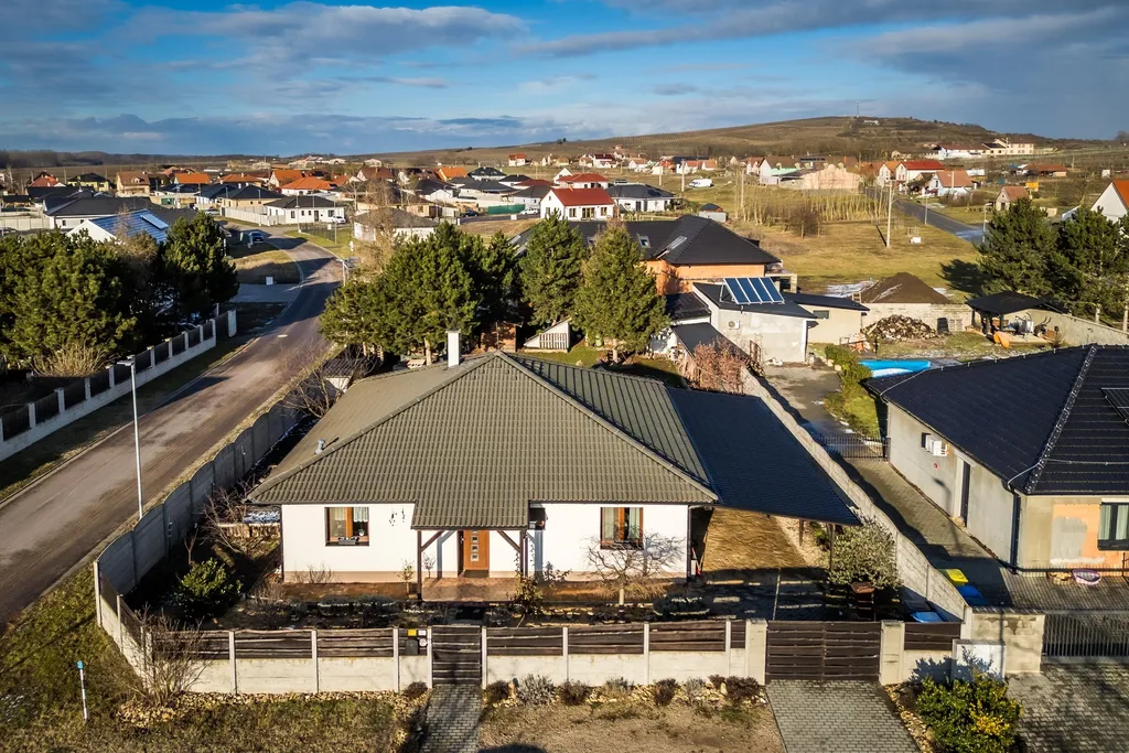 Samotný dům je velice dobře situován v rámci obce, v klidné části v blízkosti vinohradů, a nabízí užitnou plochu přibližně 110 m² (počítáno bez terasy, zimní zahrady a přístřešků pro parkování). Nemovitost je ve velmi dobrém a pečlivě udržovaném stavu. Díky promyšlené orientaci je interiér domu velmi dobře prosluněný a příjemně světlý po celý den, což vytváří velmi příjemnou atmosféru pro každodenní bydlení.